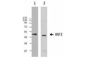 - IRF-3 is a member of the interferon regulatory transcription factor (IRF) family. It mediates interferon-stimulated response element (ISRE) promoter activation and functions as a molecular switch for antiviral activity. DsRNA generated during the course of a viral infection leads to IRF-3 phosphorylation on the C-terminal serine/threonine cluster. This induces a conformational change, leading to its dimerization, nuclear localization and association with CREB protein binding to dsRNA-activated factor 1, a complex which activates the transcription of genes under control of ISRE. The phosphorylated IRF-3 is under negative regulation by ubiquitin-mediated degradation. Research indicates that it plays a critical role in stimulated TLR-mediated IL-27 p28 gene expression.