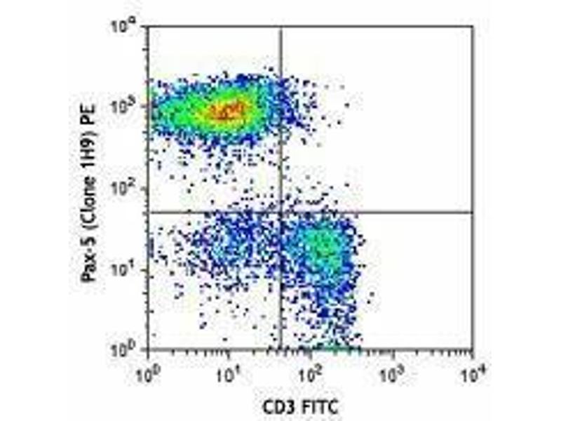 Pax5, also known as BSAP (B cell specific activator protein), is a member of the paired box (Pax) family of transcription factors. PAX proteins are important regulators in early development, and alterations in the expression of their genes are thought to contribute to neoplastic transformation. Pax5 is the only member of the Pax family of transcription factors that is expressed in hematopoietic cells. During embryogenesis, Pax5 is transiently expressed in the brain of mice and in the mesencephalon and spinal cord of humans. Its expression is upregulated early in B cell development at the time of B cell commitment and is maintained throughout most subsequent stages. Suppression of Pax5 is essential for expression of Blimp-1 and the terminal differentiation of plasma cells. In the spleen, expression of Pax5 is higher in marginal zone B cells (B220+ CD21high CD23low) than in other B cells, especially the transition 1 stage (B220+ CD21- CD23-). In addition to its role in B cell development, Pax5 also affects VH-DJH heavy chain recombination as well as influencing the expression of many other B and non-B cell related proteins. Its expression has also been detected in developing CNS and testis and so the encoded protein may also play a role in neural development and spermatogenesis. This gene is located at 9p13, which is involved in t(9,14)(p13,q32) translocations recurring in small lymphocytic lymphomas of the plasmacytoid subtype, and in derived large-cell lymphomas. This translocation brings the potent E-mu enhancer of the IgH gene into close proximity of the PAX5 promoter, suggesting that the deregulation of transcription of this gene contributes to the pathogenesis of these lymphomas. Alternatively spliced transcript variants encoding different isoforms have been described but their biological validity has not been determined.
