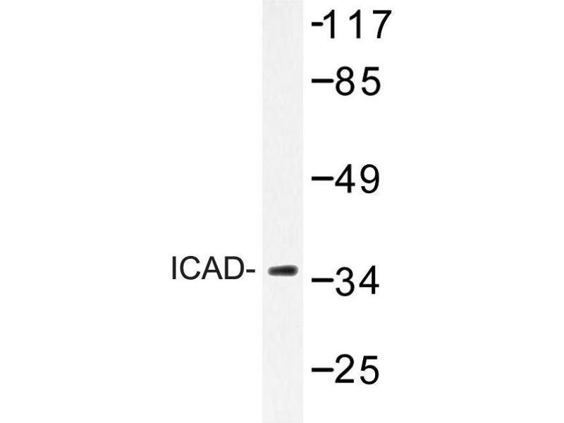 The CED/ICE family of cysteine proteases plays a pivotal role in mediating apoptosis through the proteolysis of specific targets. Among the targets are poly (ADP-ribose) polymerase (PARP), gelsolin, DFF-45/ICAD and the nuclear lamins. PARP is a 112 kDa nuclear protein that is specifically cleaved by CPP32 and Mch2, but not by ICE, into a signature 85 kDa apoptotic fragment. Gelsolin is cleaved by CPP32 to an active form that severs actin filaments in a Ca++-independent manner. In addition to binding actin, gelsolin can form complexes with fibronectin, which may be important for localizing gelsolin to inflammatory sites. DFF-45/ICAD, the 45 kDa subunit of DNA fragmentation factor, is cleaved by CPP32 to generate an active factor that induces DNA fragmentation. The 70 kDa nuclear Lamin A is cleaved by Mch2, but not CPP32. Nuclear Lamin B is fragmented as a consequence of apoptosis by an unidentified member of the ICE family.Synonyms: DFF-45, DFF1, DFF45, DNA fragmentation factor 45 kDa subunit, DNA fragmentation factor subunit alpha, Inhibitor of CAD