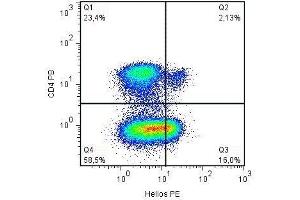 Flow cytometry: Recommended dilution: 1-4 μg/mL.,Recommended protocol: 1) Perform staining of cell surface markers (CD25, CD4 etc.) for 20 min. at room temperature in the dark, 100 μL of peripheral blood. 2) Add 3 mL of PBS with 1 % BSA, centrifugate at 300g and discard the supernatant. Further steps perform on ice and with ice-cold reagents. 3) Resuspend the cells in 5 mL of cold fixation solution (Miltenyi Biotec) and incubate for 30 min. on ice. 4) Centrifugate for 5 min. at 1000 g, 4 °C, and discard the supernatant. 5) Resuspend the cells in 5 mL of ice-cold PBS with 1 % BSA. 6) Centrifugate for 5 min. at 1000 g, 4 °C, and discard the supernatant. 7) Resuspend the cells in 5 mL of ice-cold permeabilization solution (Miltenyi Biotec) and incubate 5 min. 8) Centrifugate for 5 min. at 1000 g, 4 °C, and discard the supernatant. 9) Resuspend the cells in μl of ice-cold permeabilization solution and add 20 μL of FcR blocking solution and incubate for 5 min. (4 °C, in the dark). 10) Perform intracellular staining of Helios for 30 min. (4 °C, in the dark) with 10 μL of anti-Helios PE antibody (22F6) in 100 μL. 11) Add 2 mL of ice-cold permeabilization solution and incubate for 5 min. at 4 °C in the dark. 12) Centrifugate for 5 min. at 1000 g, 4 °C, and discard the supernatant. 13) Resuspend the cells in 3 mL of ice-cold PBS with 1 % BSA. 14) Centrifugate for 5 min. at 1000 g, 4 °C, and discard the supernatant. 15) Resuspend the cells in 150 μL of ice-cold PBS with 1 % BSA and measure on a flow cytometry device with appropriate setting as soon as possible. Keep cold until measuring.