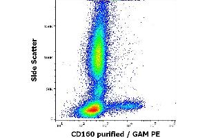 The mouse monoclonal antibody BY55 recognizes an extracellular epitope of CD160, a 27 kDa glycoprotein expressed on NK cells, NK-T cells, intestinal intraepithelial lymphocytes, TCR-gamma/delta T cells and a small population of TCR-alpha/beta T cells. The antibody detects both GPI-anchored and transmembrane form of CD160.
