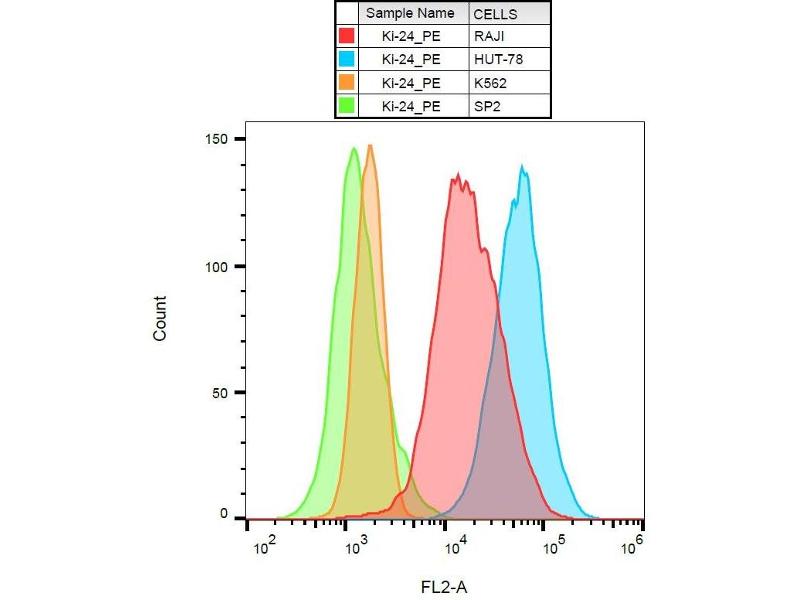 The mouse monoclonal antibody Ki-24 recognizes an extracellular epitope of CD70, an approximately 50 kDa type II transmembrane glycoprotein expressed on activated lymphocytes and some B cell leukemias.