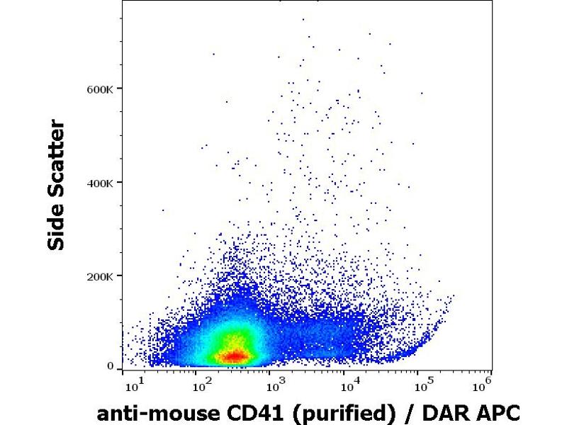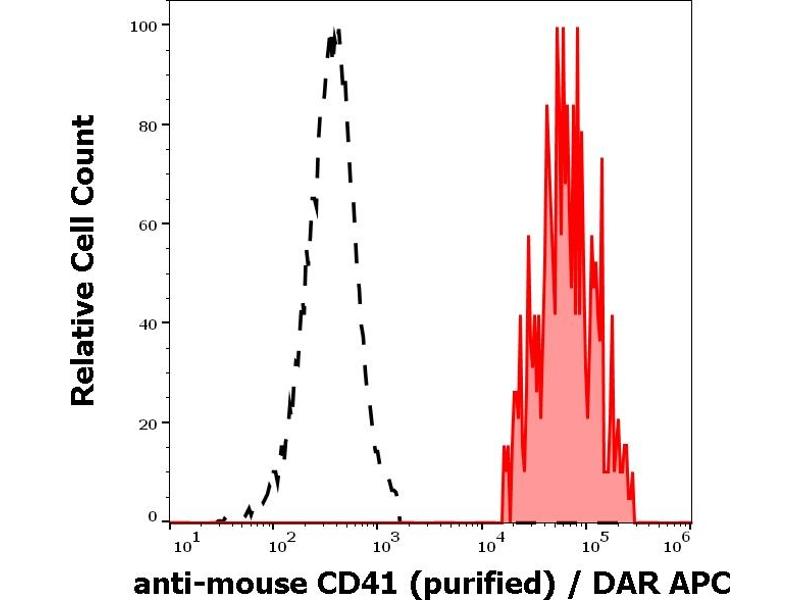 The rat monoclonal antibody MWReg30 recognizes an extracellular epitope of CD41 (GPIIb), a transmembrane glycoprotein (integrin family) composed of two chains GPIIb alpha (heavy chain, 120 kDa) and GPIIb beta (light chain, 23 kDa). CD41 is mainly expressed on platelets and megakaryocytes.