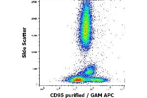 Fas cell surface death receptor,CD95 (Fas, APO-1), a 46 kDa transmembrane glycoprotein, is a cell death receptor of the TNFR superfamily. Stimulation of CD95 results in aggregation of its intracellular death domains, formation of the death-inducing signaling complex (DISC) and activation of caspases. In type I cells caspase 3 is activated by high amounts of caspase 8 generated at the DISC, in type II cells low concentration of caspase 8 activates pathway leading to the release of cytochrome c from mitochondria and activation of caspase 3 by cytochom c. Besides its roles in induction of apoptosis, Fas also triggers pro-inflammatory cytokine responses.,FAS1, APT1, APO-1, FASTM, ALPS1A, TNFRSF6