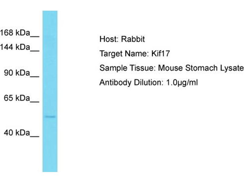 This is a rabbit polyclonal antibody against Kif17. It was validated on Western Blot.