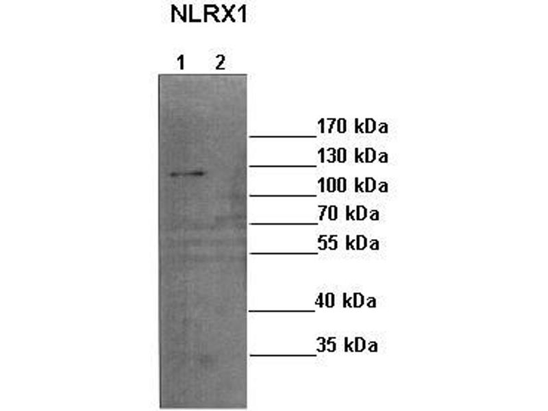 Der Kaninchen Polyklonal anti-NLRX1 Antikörper (ABIN2774419) detektiert spezifisch NLRX1 in WB.