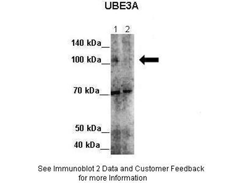 UBE3A is an E3 ubiquitin-protein ligase, part of the ubiquitin protein degradation system. This imprinted gene is maternally expressed in brain and biallelically expressed in other tissues. Maternally inherited deletion of this gene causes Angelman Syndrome, characterized by severe motor and intellectual retardation, ataxia, hypotonia, epilepsy, absence of speech, and characteristic facies. The protein also interacts with the E6 protein of human papillomavirus types 16 and 18, resulting in ubiquitination and proteolysis of tumor protein p53.Western blots using two different antibodies against two unique regions of this protein target confirm the same apparent molecular weight in our tests.This gene encodes an E3 ubiquitin-protein ligase, part of the ubiquitin protein degradation system. This imprinted gene is maternally expressed in brain and biallelically expressed in other tissues. Maternally inherited deletion of this gene causes Angelman Syndrome, characterized by severe motor and intellectual retardation, ataxia, hypotonia, epilepsy, absence of speech, and characteristic facies. The protein also interacts with the E6 protein of human papillomavirus types 16 and 18, resulting in ubiquitination and proteolysis of tumor protein p53. Alternative splicing of this gene results in three transcript variants encoding three isoforms with different N-termini. Additional transcript variants have been described, but their full length nature has not been determined.