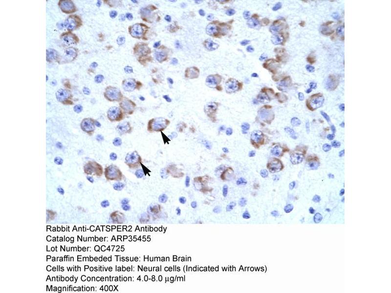 Calcium ions play a primary role in the regulation of sperm motility. Anti-CATSPER2 belongs to a family of putative cation channels that are specific to spermatozoa and localize to the flagellum. The protein family features a single repeat with six membrane-spanning segments and a predicted calcium-selective pore region. A second, closely linked copy of this gene has been identified. Although multiple transcript variants encoding protein isoforms have been characterized, they seem to be only transcribed from this gene. Additional splice variants have been described but their full-length nature has not been determined.