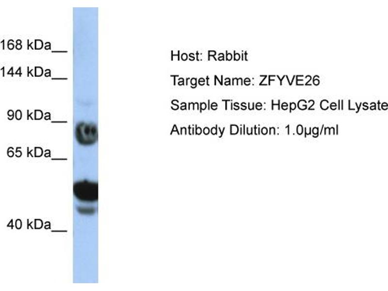This is a rabbit polyclonal antibody against ZFYVE26. It was validated on Western Blot.
