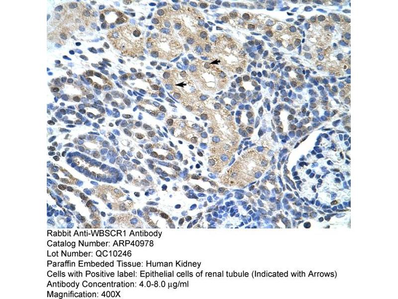 This is a rabbit polyclonal antibody against WBSCR1. It was validated on Western Blot and immunohistochemistry.