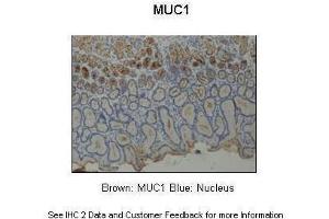 MUC1 is a membrane bound, glycosylated phosphoprotein. The protein is anchored to the apical surface of many epithelia by a transmembrane domain, with the degree of glycosylation varying with cell type. It also includes a 20 aa variable number tandem repeat (VNTR) domain, with the number of repeats varying from 20 to 120 in different individuals. The protein serves a protective function by binding to pathogens and also functions in a cell signaling capacity. Overexpression, aberrant intracellular localization, and changes in glycosylation of this protein have been associated with carcinomas. This gene is a member of the mucin family and encodes a membrane bound, glycosylated phosphoprotein. The protein is anchored to the apical surface of many epithelia by a transmembrane domain, with the degree of glycosylation varying with cell type. It also includes a 20 aa variable number tandem repeat (VNTR) domain, with the number of repeats varying from 20 to 120 in different individuals. The protein serves a protective function by binding to pathogens and also functions in a cell signaling capacity. Overexpression, aberrant intracellular localization, and changes in glycosylation of this protein have been associated with carcinomas. Multiple alternatively spliced transcript variants that encode different isoforms of this gene have been reported, but the full-length nature of only some has been determined.