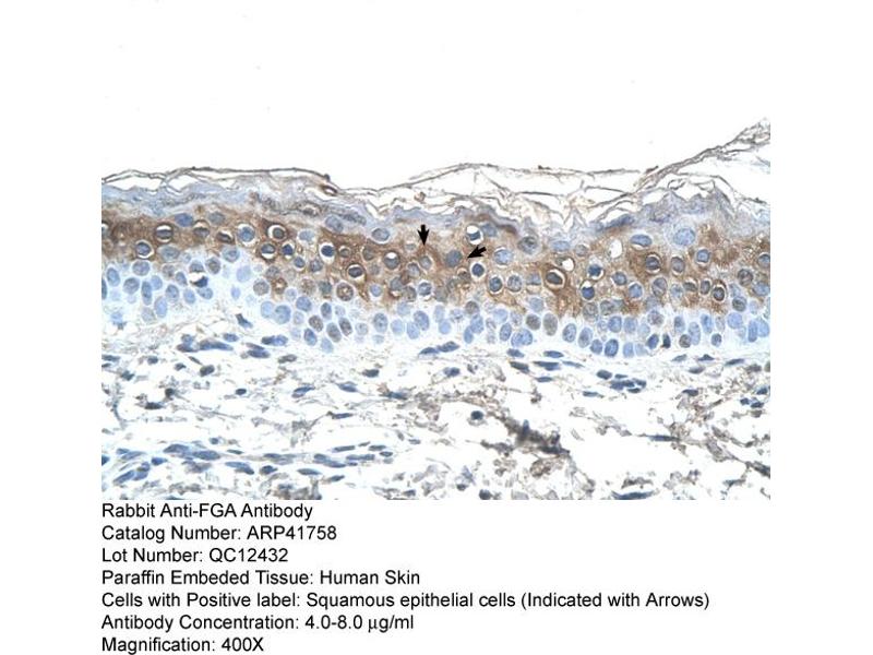 - The immunogen is a synthetic peptide directed towards the N terminal region of human FGA