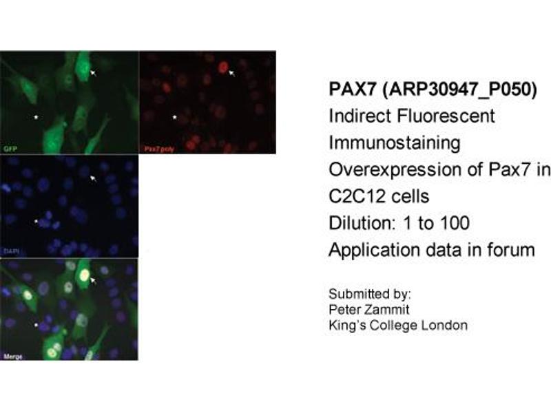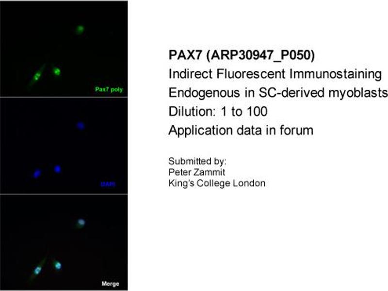 - The immunogen is a synthetic peptide directed towards the middle region of human Pax7