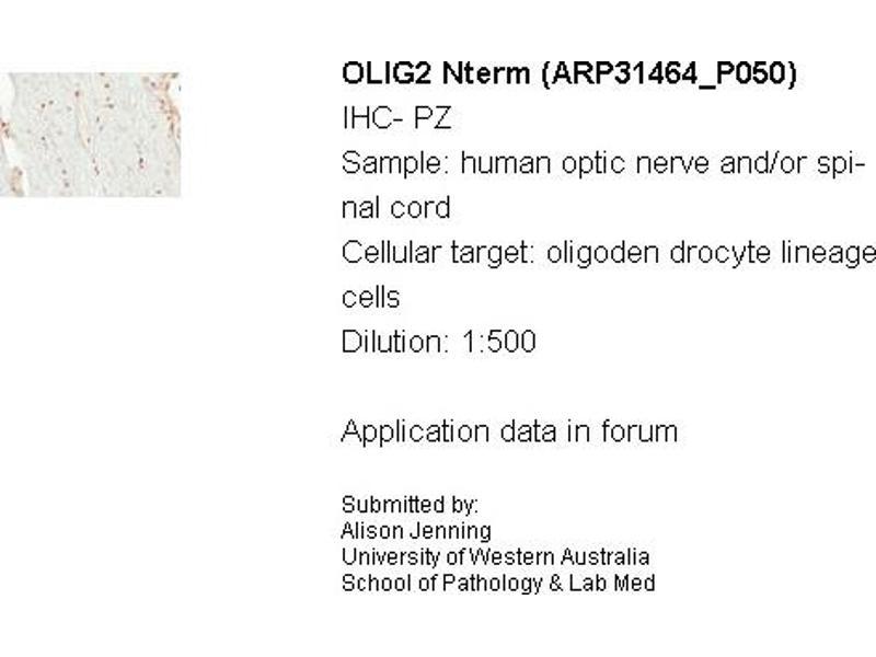 - The immunogen is a synthetic peptide directed towards the N terminal region of human OLIG2