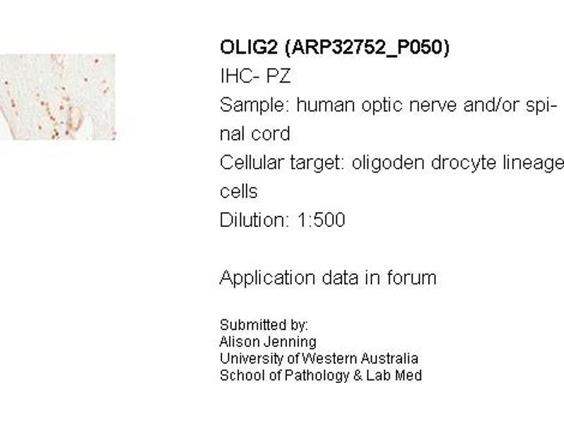 - The immunogen is a synthetic peptide directed towards the N terminal region of human OLIG2