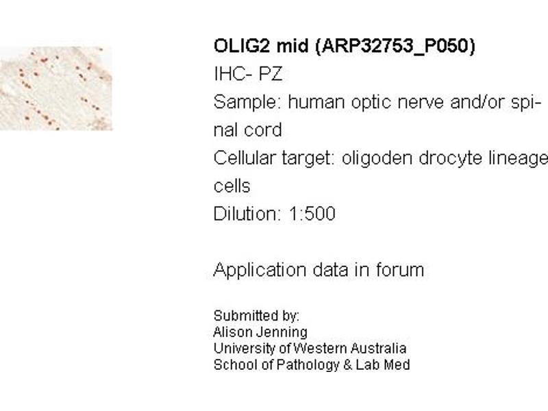 - The immunogen is a synthetic peptide directed towards the C-terminal region of Human OLIG2