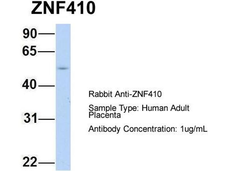 - This is a rabbit polyclonal antibody against ZNF410. It was validated on Western Blot using a cell lysate as a positive control.