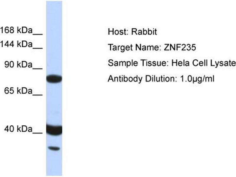 Der Kaninchen Polyklonal anti-ZNF235 Antikörper (ABIN2777992) detektiert spezifisch ZNF235 in WB.