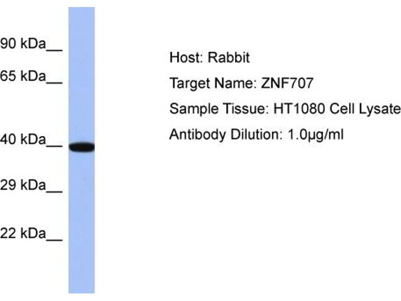 ZNF707 belongs to the krueppel C2H2-type zinc-finger protein family and may be involved in transcriptional regulation. Alias Symbols: - Protein Interaction Partner: KRTAP10-5, KRTAP10-7, CCNDBP1, RALBP1, MDFI, Protein Size: 371
