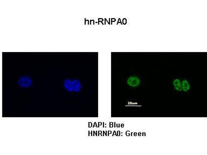 HNRPA0 belongs to the A/B subfamily of ubiquitously expressed heterogeneous nuclear ribonucleoproteins (hnRNPs). The hnRNPs are RNA binding proteins and they complex with heterogeneous nuclear RNA (hnRNA). These proteins are associated with pre-mRNAs in the nucleus and appear to influence pre-mRNA processing and other aspects of mRNA metabolism and transport. While all of the hnRNPs are present in the nucleus, some seem to shuttle between the nucleus and the cytoplasm. The hnRNP proteins have distinct nucleic acid binding properties. The protein encoded by this gene has two repeats of quasi-RRM domains that bind RNAs, followed by a glycine-rich C-terminus.This gene belongs to the A/B subfamily of ubiquitously expressed heterogeneous nuclear ribonucleoproteins (hnRNPs). The hnRNPs are RNA binding proteins and they complex with heterogeneous nuclear RNA (hnRNA). These proteins are associated with pre-mRNAs in the nucleus and appear to influence pre-mRNA processing and other aspects of mRNA metabolism and transport. While all of the hnRNPs are present in the nucleus, some seem to shuttle between the nucleus and the cytoplasm. The hnRNP proteins have distinct nucleic acid binding properties. The protein encoded by this gene has two repeats of quasi-RRM domains that bind RNAs, followed by a glycine-rich C-terminus.