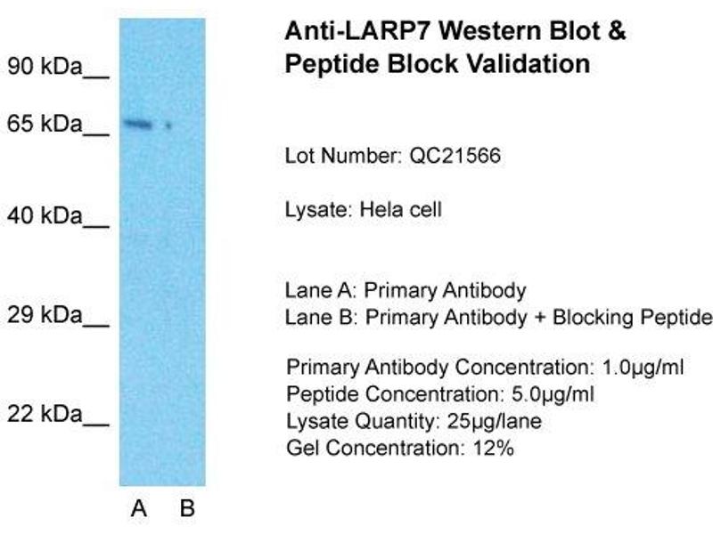 - This is a rabbit polyclonal antibody against LARP7. It was validated on Western Blot using a cell lysate as a positive control.
