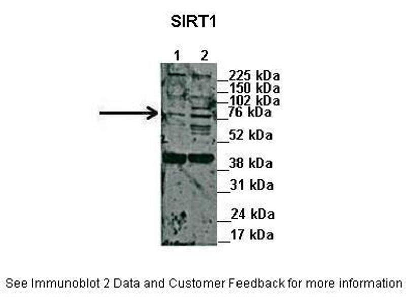- This is a rabbit polyclonal antibody against SIRT1. It was validated on Western Blot using a cell lysate as a positive control.