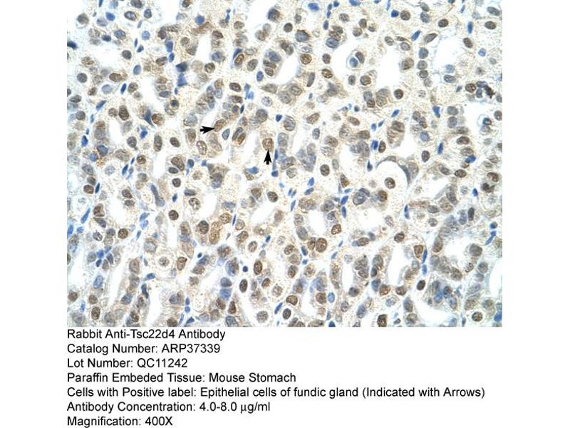 This is a rabbit polyclonal antibody against Tsc22d4. It was validated on Western Blot and immunohistochemistry.