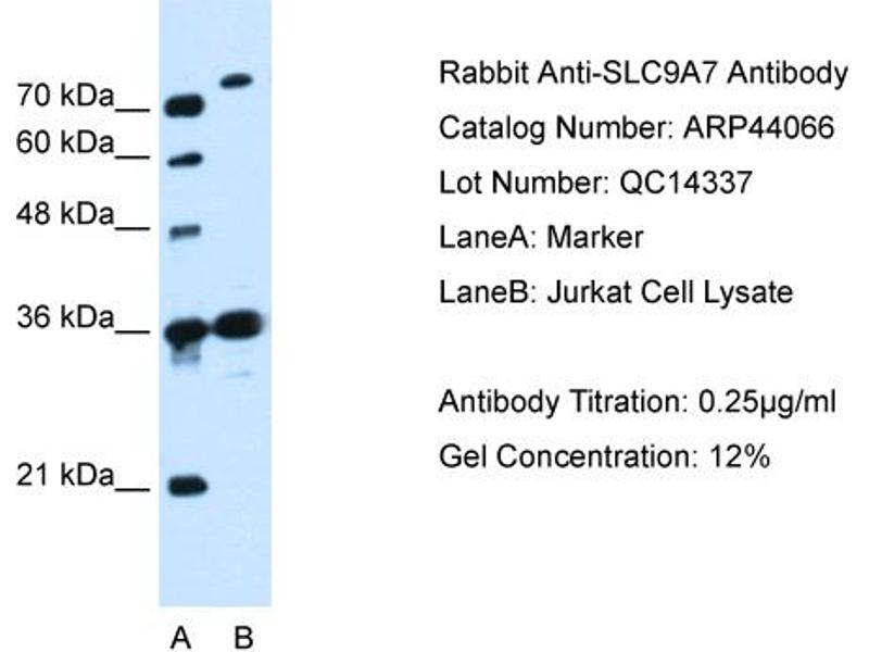 - This is a rabbit polyclonal antibody against SLC9A7. It was validated on Western Blot using a cell lysate as a positive control.