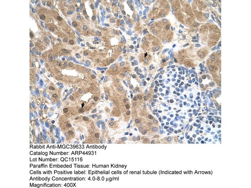 - This is a rabbit polyclonal antibody against MGC39633. It was validated on Western Blot and immunohistochemistry.