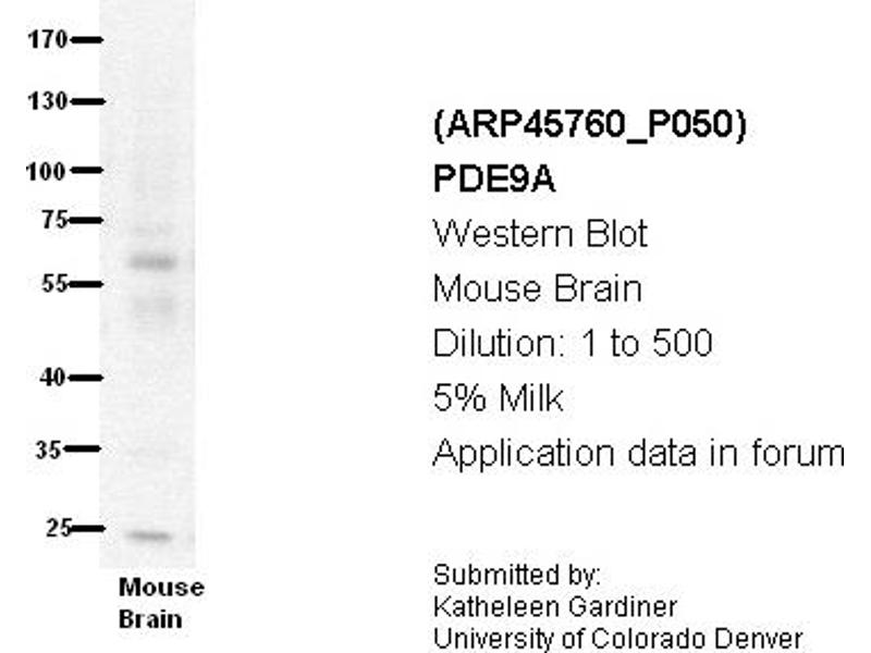 This is a rabbit polyclonal antibody against PDE9A. It was validated on Western Blot and immunohistochemistry.