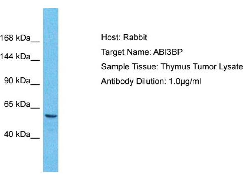 ABI3BP contains 2 fibronectin type-III domains. The loss of ABI3BP expression could play a functional role in thyroid tumorigenesis. It also presumably represents a trigger gene for evoking cellular senescence, which has also been suggested to be involved in the prevention of tumorigenesis. Alias Symbols: NESHBP, TARSH Protein Interaction Partner: UBC, CBX1, FZD5, MBNL1, GOT1, GRK5, MYC, GRB2, ABI3, Protein Size: 486