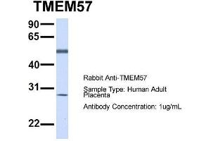 This is a rabbit polyclonal antibody against TMEM57. It was validated on Western Blot using a cell lysate as a positive control.