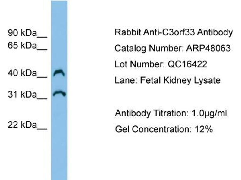 - This is a rabbit polyclonal antibody against C3orf33. It was validated on Western Blot using a cell lysate as a positive control.