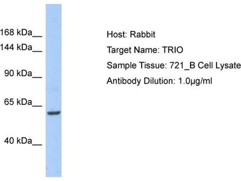 TRIO promotes the exchange of GDP by GTP. Together with leukocyte antigen-related (LAR) protein, it could play a role in coordinating cell-matrix and cytoskeletal rearrangements necessary for cell migration and cell growth. Protein Interaction Partner: RAC1, RHOG, NAV2, NAV1, NAV3, MAPRE1, DAB2, BCAS2, ITSN2, UBC, EXOC1, DISC1, CDC5L, BLMH, PTK2, FLNA, PTPRF, RHOA, Protein Size: 596