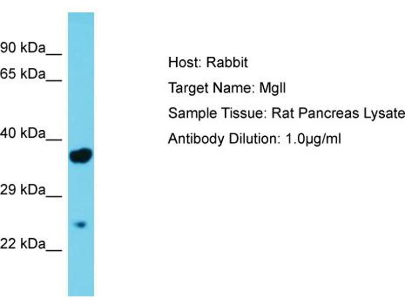 Mgll converts monoacylglycerides to free fatty acids and glycerol. Mgll hydrolyzes the endocannabinoid 2-arachidonoylglycerol, and thereby contributes to the regulation of endocannabinoid signaling, nociperception and perception of pain. It regulates the levels of fatty acids that serve as signaling molecules and promote cancer cell migration, invasion and tumor growth. Alias Symbols: MAGL Protein Size: 303