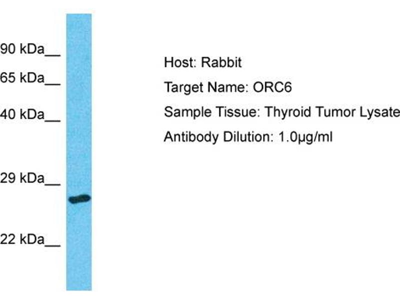 The origin recognition complex (ORC) is a highly conserved six subunit protein complex essential for the initiation of the DNA replication in eukaryotic cells. Studies in yeast demonstrated that ORC binds specifically to origins of replication and serves as a platform for the assembly of additional initiation factors such as Cdc6 and Mcm proteins. ORC6L is a subunit of the ORC complex. It has been shown that this protein and and ORC1L are loosely associated with the core complex consisting of ORC2L, -3L, -4L and -5L. Gene silencing studies with small interfering RNA demonstrated that this protein plays an essential role in coordinating chromosome replication and segregation with cytokinesis. Alias Symbols: ORC6L Protein Interaction Partner: LHX4, SPAG5, UBC, ORC3, CDC7, ORC4, MCM7, MCM6, MCM4, MCM2, CDC6, APP, ORC2, SUMO2, XRCC5, XRCC6, HMGA1, MCM5, TERF2, ORC5, DBF4, CDC45, RPA1, Protein Size: 252