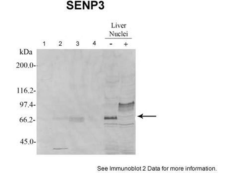 - This is a rabbit polyclonal antibody against SENP3. It was validated on Western Blot using a cell lysate as a positive control.