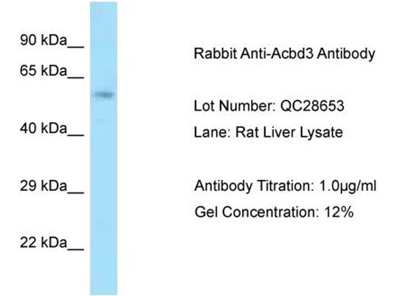This is a rabbit polyclonal antibody against Acbd3. It was validated on Western Blot.