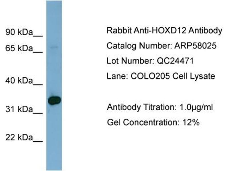 - This is a rabbit polyclonal antibody against HOXD12. It was validated on Western Blot using a cell lysate as a positive control.