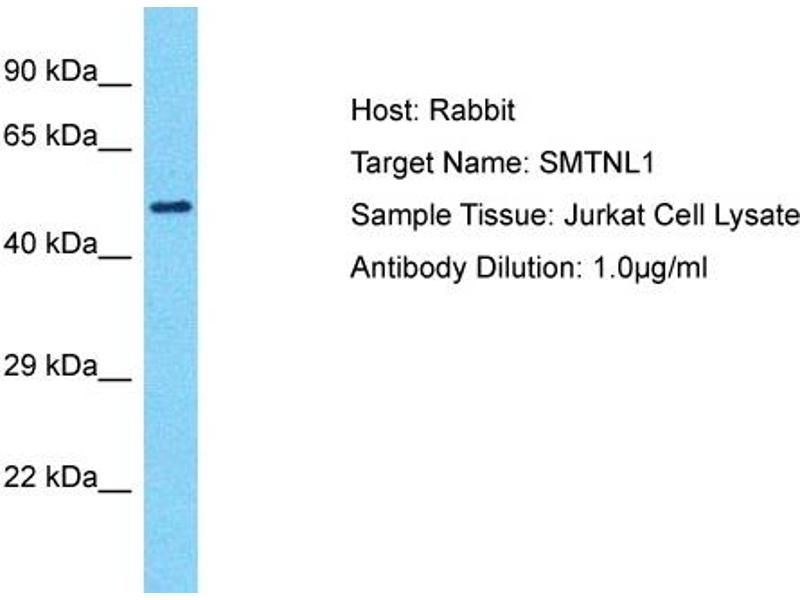 Der Kaninchen Polyklonal anti-SMTNL1 Antikörper (ABIN2790503) detektiert spezifisch SMTNL1 in WB.