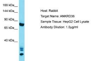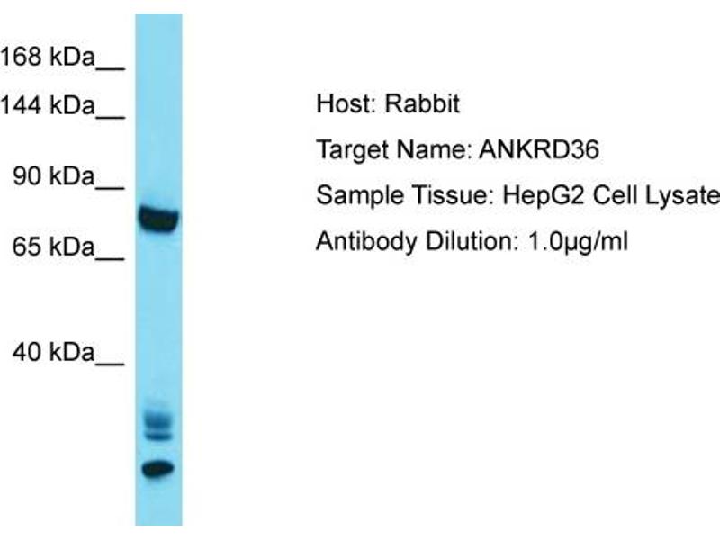 This is a rabbit polyclonal antibody against ANKRD36. It was validated on Western Blot.