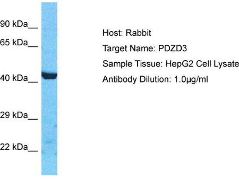 Der Kaninchen Polyklonal anti-PDZD3 Antikörper (ABIN2791849) detektiert spezifisch PDZD3 in WB.