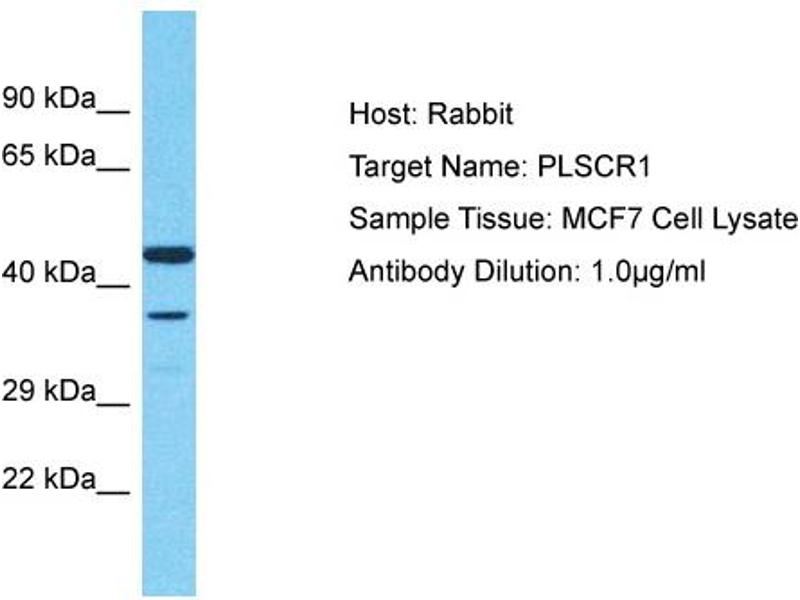 PLSCR1 may mediate accelerated ATP-independent bidirectional transbilayer migration of phospholipids upon binding calcium ions that results in a loss of phospholipid asymmetry in the plasma membrane.PLSCR1 may play a central role in the initiation of fibrin clot formation, in the activation of mast cells and in the recognition of apoptotic and injured cells by the reticuloendothelial system. Alias Symbols: MMTRA1B Protein Interaction Partner: PKD2, P2RY6, ILF3, EWSR1, ESR2, DOCK2, CTSZ, CATSPER1, LONRF1, KRTAP4-2, ZNF587, LINC01547, KRTAP9-2, GDPD5, SCNM1, DMRT3, VPS37C, PRR13, DEF6, LGALS9C, KRTAP4-11, KRTAP5-6, KRTAP10-3, KRTAP10-11, KRTAP10-9, LCE3C, LCE2D, TRIM42, BCL6B, LCE4A, ZNF417, MGA Protein Size: 318