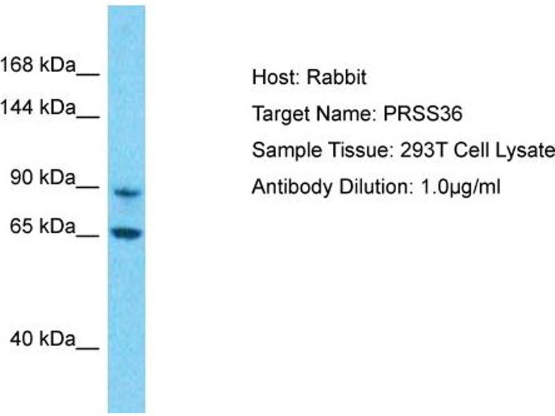 PRSS36 is a Serine protease. It hydrolyzes the peptides N-t-Boc-Gln- Ala-Arg-AMC and N-t-Boc-Gln-Gly-Arg-AMC and, to a lesser extent, N-t-Boc-Ala-Phe-Lys-AMC and N-t-Boc-Val-Leu-Lys-AMC. It has a preference for substrates with an Arg instead of a Lys residue in position P1. Alias Symbols: - Protein Size: 855