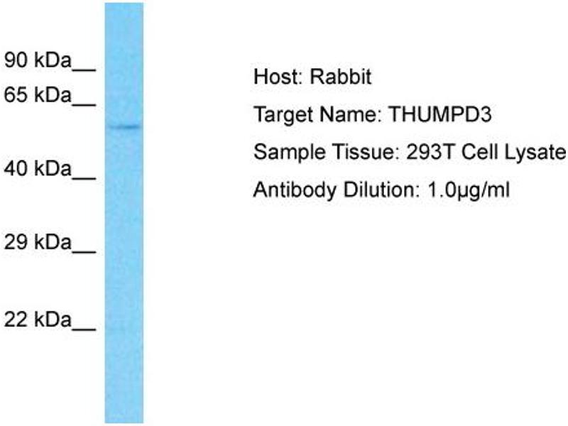 Der Kaninchen Polyklonal anti-THUMPD3 Antikörper wird verwendet zum Nachweis von THUMPD3 in Proben von Human, Hund und Schwein. Er wurde validiert für WB.