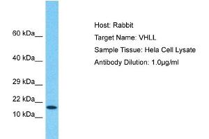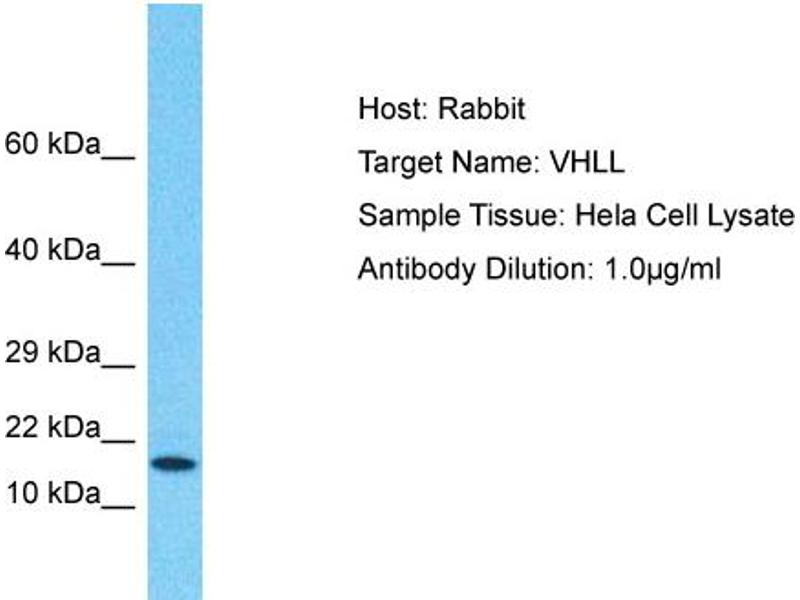 Von Hippel-Lindau (VHL) tumor suppressor protein is a component of an E3 ubiquitin ligase complex that selectively ubiquitinates the alpha subunit of the hypoxia-inducible factor (HIF) transcription factor for proteasome-mediated degradation. Inactivation of VHL causes VHL disease and sporadic kidney cancer. This gene encodes a VHL homolog that lacks one of two key domains necessary for VHL function. This gene may contribute to the regulation of oxygen homeostasis and neovascularization during placenta development. This gene is intronless, and can also be interpreted as a retrotransposed pseudogene of the VHL locus located on chromosome 3. However, the protein is represented in this RefSeq due to evidence in PMID:14757845 that strongly suggests it is translated. The same publication also indicates that this protein binds HIF alpha but fails to recruit the E3 ubiquitin ligase complex, and it therefore functions as a dominant-negative VHL protein and a protector of HIF alpha. Alias Symbols: VHLP, VLP Protein Interaction Partner: RBPMS, DAZAP2, HIF1A, Protein Size: 139