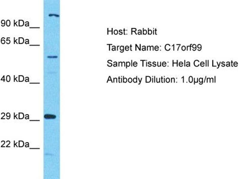 This is a rabbit polyclonal antibody against C17orf99. It was validated on Western Blot.