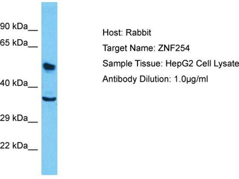 ZNF254 is a Zinc Finver protein. Zinc finger proteins have been shown to interact with nucleic acids and to have diverse functions. The zinc finger domain is a conserved amino acid sequence motif containing 2 specifically positioned cysteines and 2 histidines that are involved in coordinating zinc. Kruppel-related proteins form 1 family of zinc finger proteins. Protein Interaction Partner: UBC, Protein Size: 351