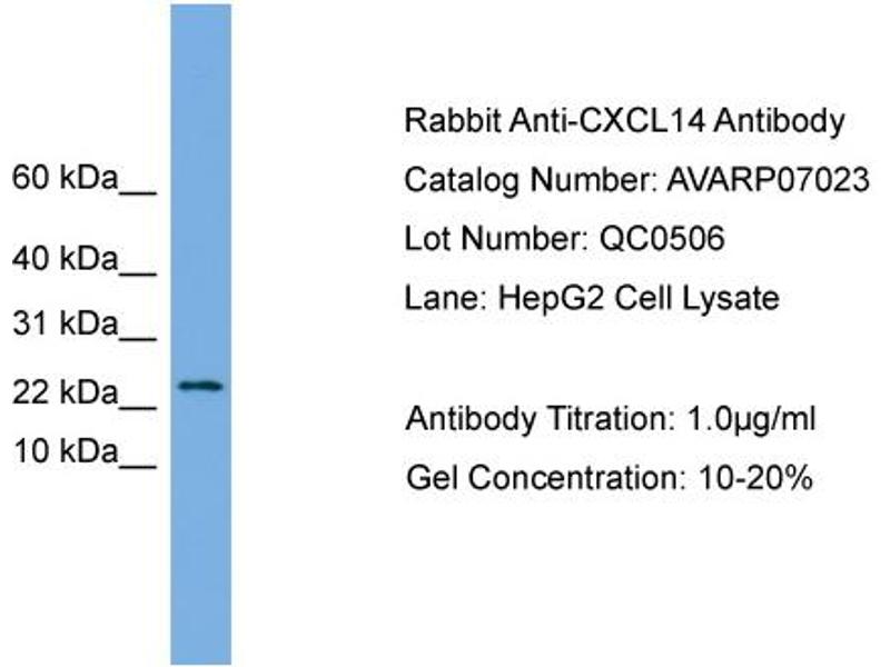 This is a rabbit polyclonal antibody against CXCL14. It was validated on Western Blot.