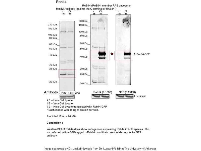- This is a rabbit polyclonal antibody against RAB14. It was validated on Western Blot using a cell lysate as a positive control.